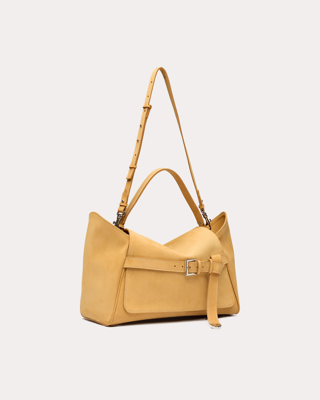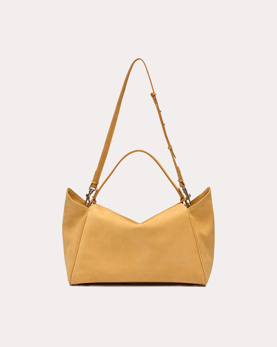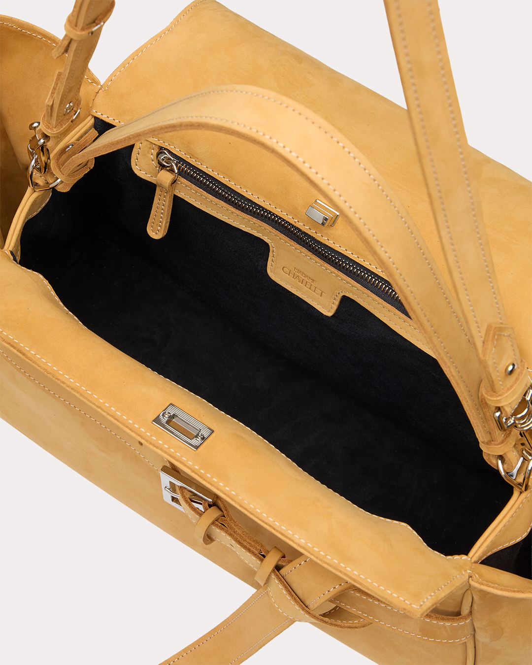 Объёмная, вместительная, сделана вручную из натуральной мелковорсистой кожи, визуально и тактильно делающей сумку похожей на замшевую, но гораздо более износостойкой.